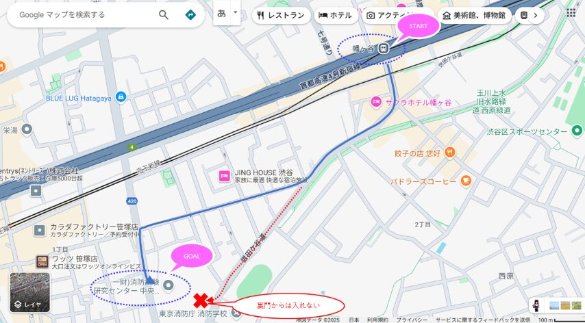 なお会場裏手の入り口は封鎖されていて入れません(地図上×の箇所)。