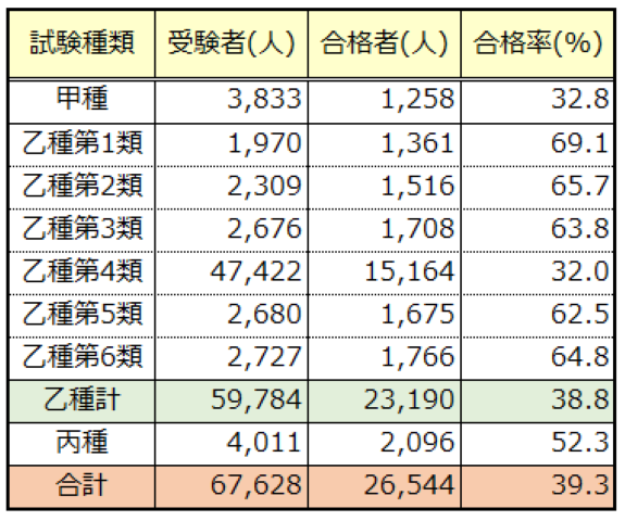 乙種を見ると、乙4が最も合格率が低いですが、おそらく最初にチャレンジする方が多く、科目免除が使えないためではないでしょうか。