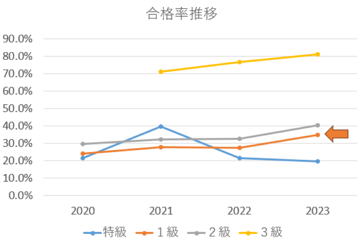 「合格率」を調べたところ、2級も1級もそんなに変わらないため、2級はスルーしました。