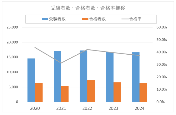 一次試験(全部門合計)の合格率は30~50%を推移しています↓