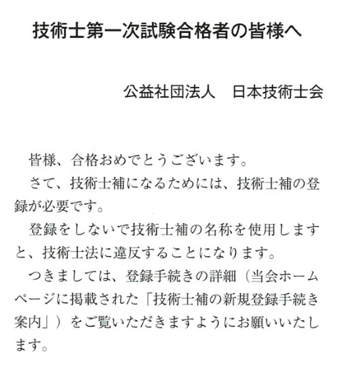 ちなみに一次試験合格後、所定の手続きを踏むことで技術士補を名乗ることができるようになります。