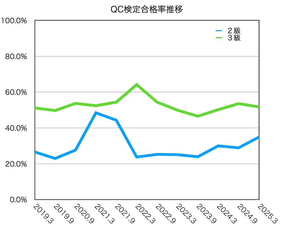 QC検定2級の合格率は30%前後を推移しています。